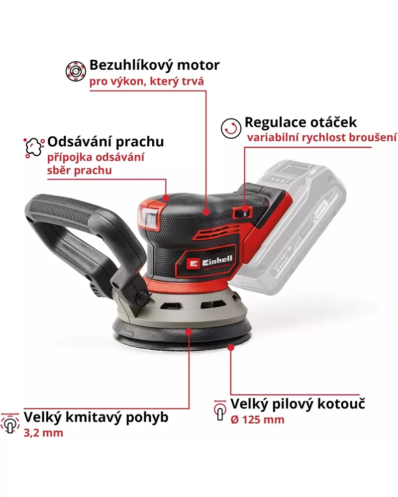 Aku excentrická bruska 18V/bez aku TP-RS 18/32 Li BL - Solo Einhell 4462020 Člen rodiny Power X-Change, nutná 1x 18 V baterie Bezuhlíkový motor -… Celý popis