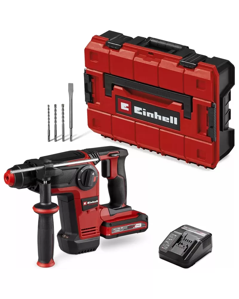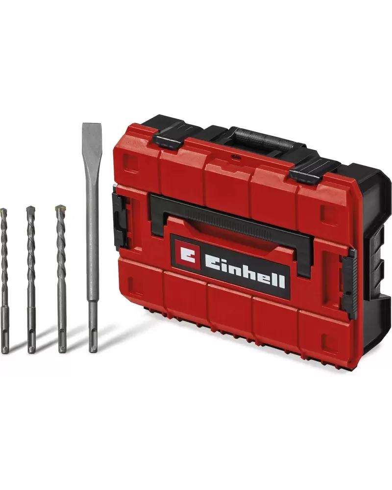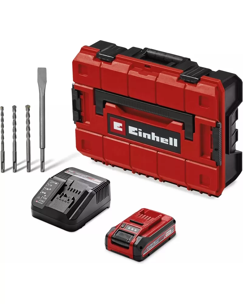 • Sada je dodávána v praktickém přepravním a úložném kufříku E-Case S, spolu se třemi vrtáky do betonu (O 8, 10, 12 mm) a plochým sekáčem. K dispozici je také baterie Power X-Change Plus 3,0 Ah a nabíječka.