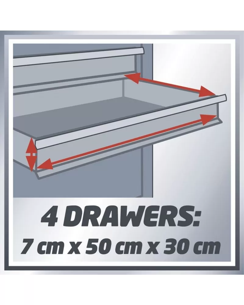 • Je vybaven čtyřmi zásuvkami s hladkým chodem a blokovacím systémem, úložným prostorem s klopou, speciálně konstruované pro stroje.