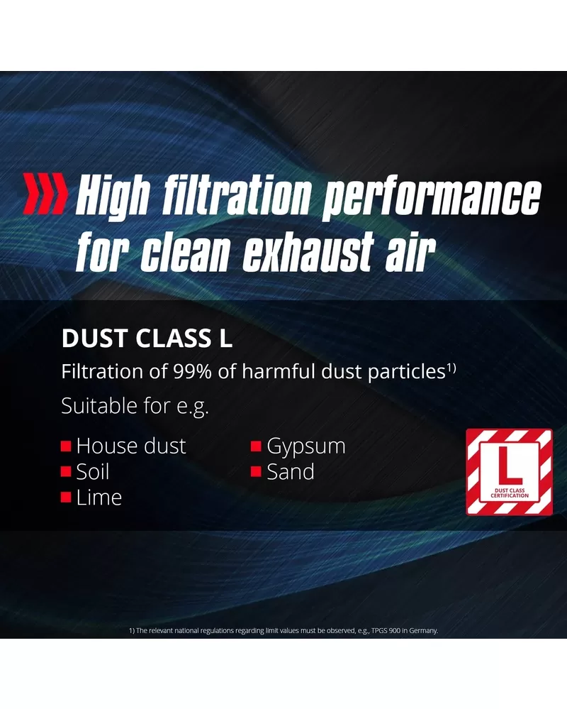• Vysavač splňuje prachovou třídu L dle Euronorm a je tedy vhodný i pro odsávání nebezpečného prachu jako je prach ze sádrokartonu, vápna, písku nebo zeminy – ideální použití na stavbě.