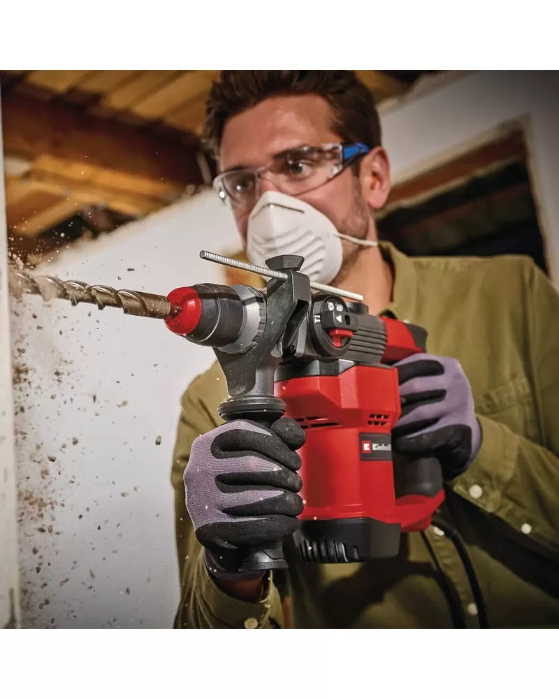 • Vrtací kladivo Einhell TC-RH 28 3F kombinuje tři funkce v jednom nástroji: vrtání, příklepové vrtání a sekání s blokováním otáčení.