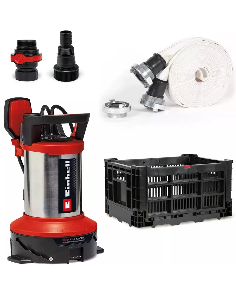 • Povodňová sada Einhell GE‑DP 7535 N LL obsahuje 2‑v‑1 čerpadlo s univerzálním adaptérem pro hadice 25/38 mm a 33,3 mm (1" vnější závit), 10 m dlouhou textilní hadici se třemi rychlospojkami, quick‑connector a plastovou krabičku, která zabraňuje ucpání bahnem