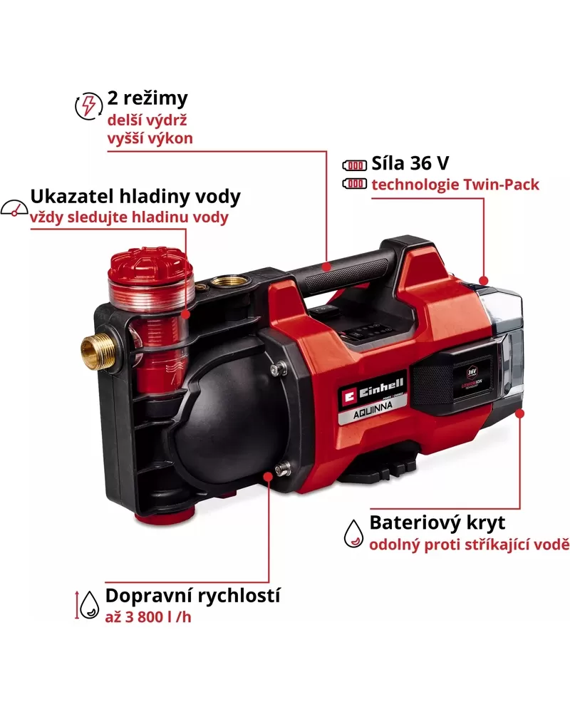 • Einhell Aku zahradní čerpadlo AQUINNA 36/38 F LED je výkonné čerpadlo, které lze použít všude kolem domu a zahrady, když je třeba vodu čerpat z bodu A do bodu B bez samostatného napájecího připojení.
