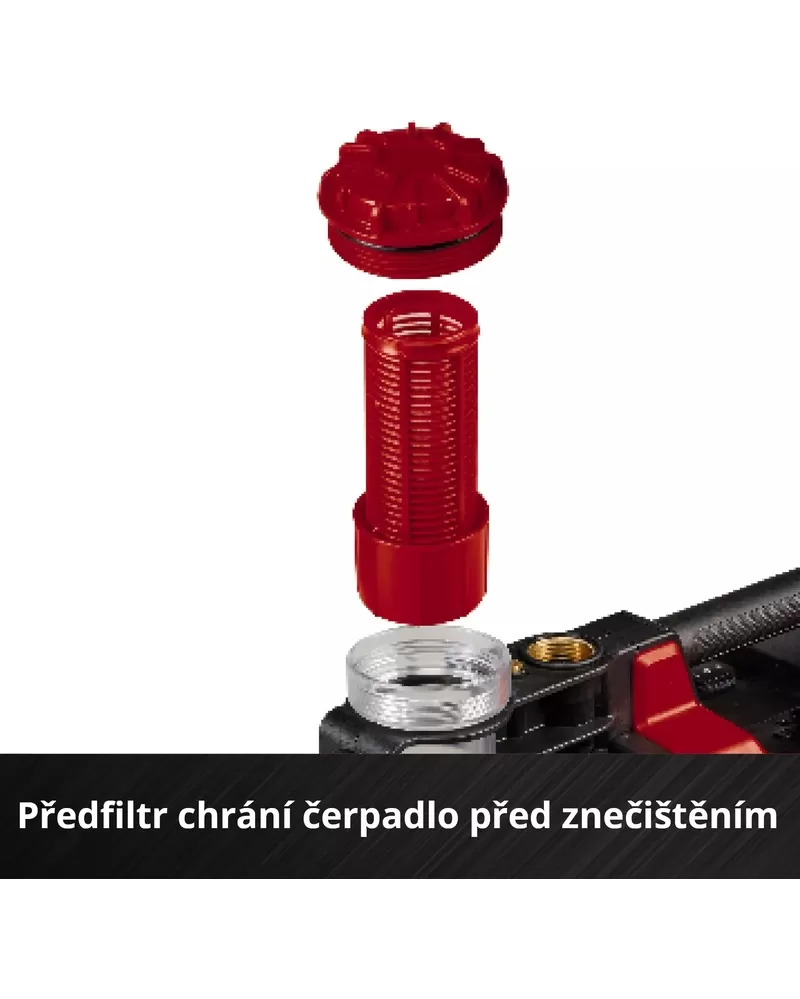 • Pro jednoduché plnění, např. při prvním sacím procesu, má čerpadlo velký plnicí šroub. Čerpadlo jde snadno vyprázdnit, zejména pro ochranu proti mrazu v zimě, s pomocí odvodňovacího šroubu na spodní straně. Pro ochranu před kontaminací je zahradní čerpadlo vybaveno předfiltrem. To je obklopeno průhledným krytem, který umožňuje kdykoli zjistit, zda bylo čerpadlo dostatečně naplněno vodou a zda je filtr znečištěný a měl by být vyčištěn.