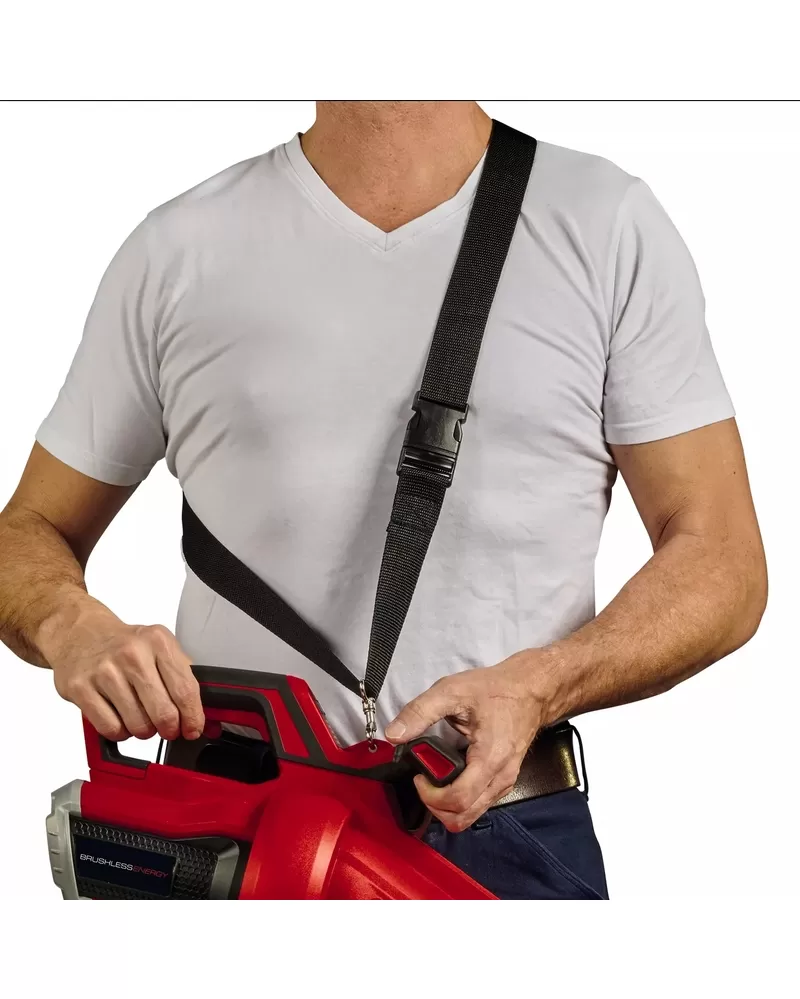 • Díky přídavné rukojeti lze aku vysavač listí optimálně ovládat oběma rukama, optimální odlehčení zajišťuje také pohodlný popruh pro přenášení.