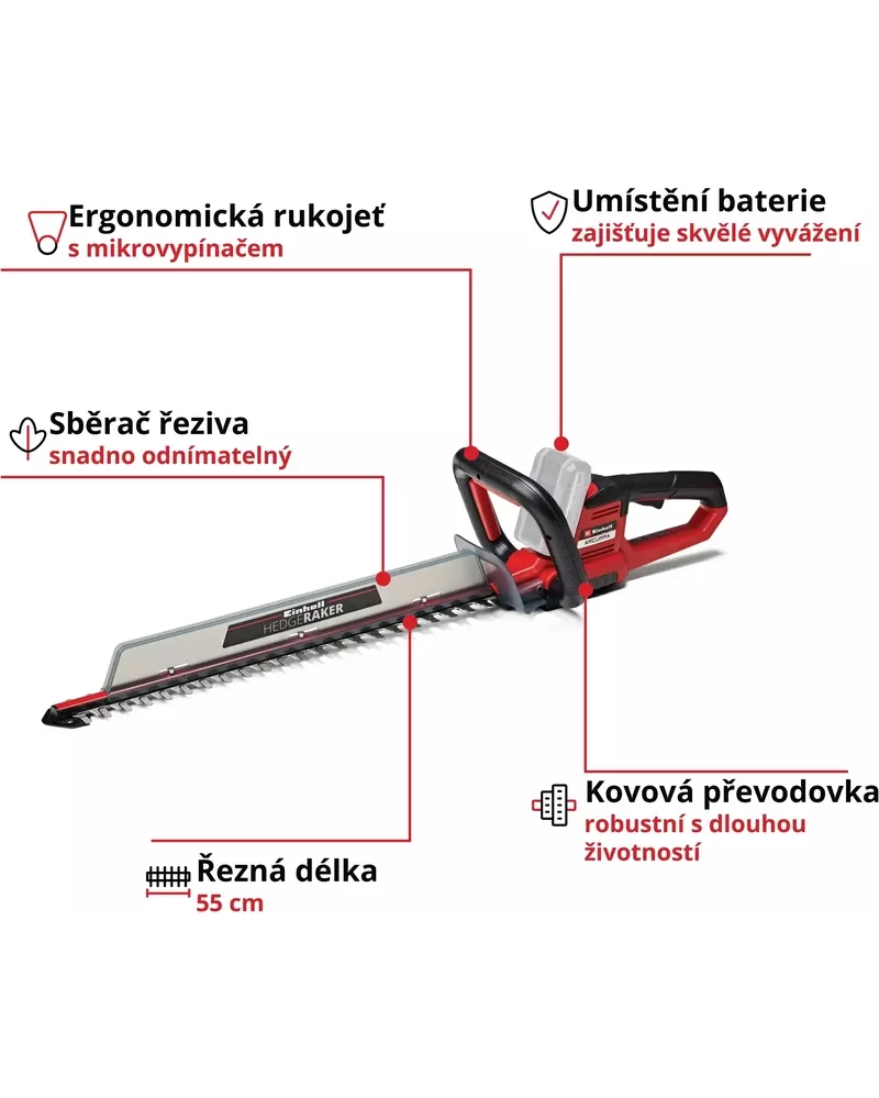 • Aku nůžky na živý plot GE-CH 1846 Li jsou vysoce výkonný přístroj, který díky své nízké hmotnosti a praktické velikosti umožňuje mimořádně pohodlnou, na elektrické síti nezávislou, údržbu živých plotů, keřů a křovin na velkých pozemcích a v zahrádkářských koloniích