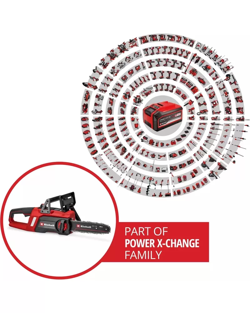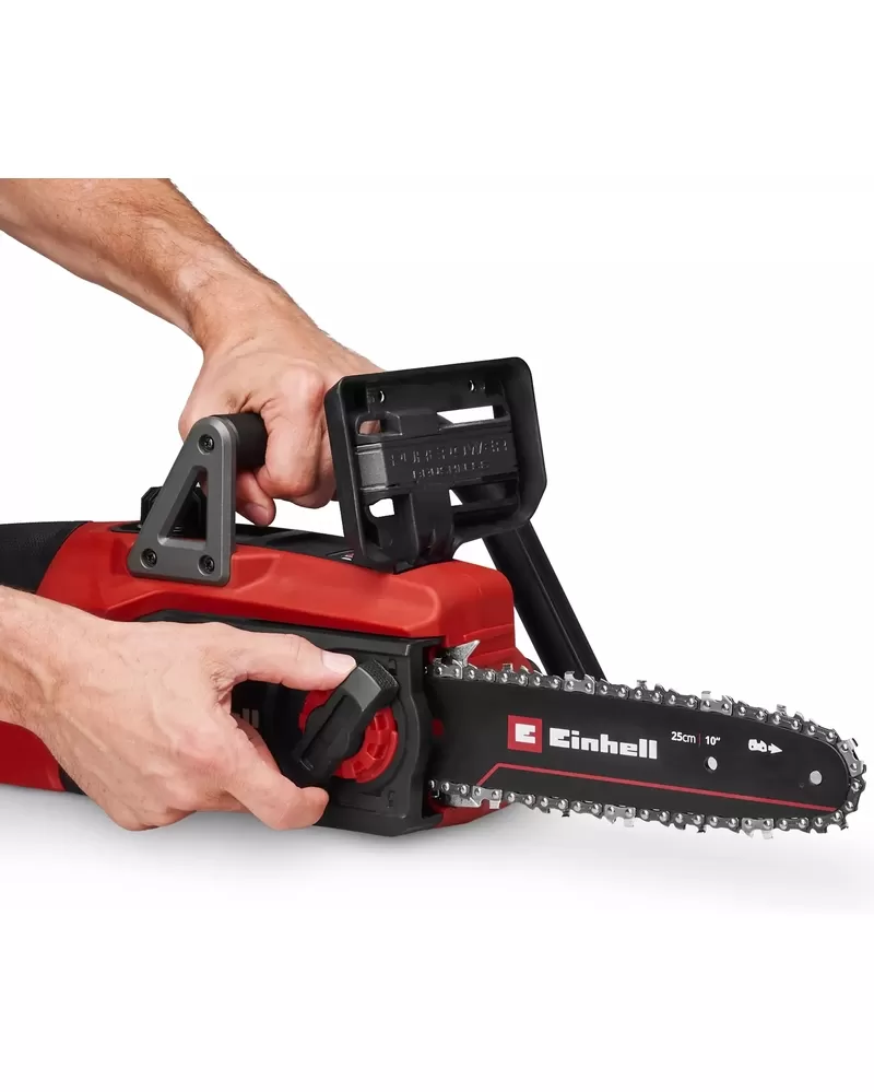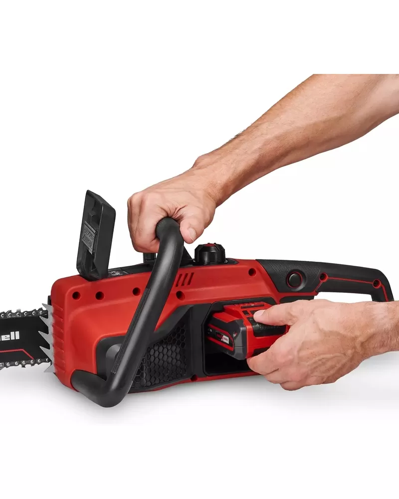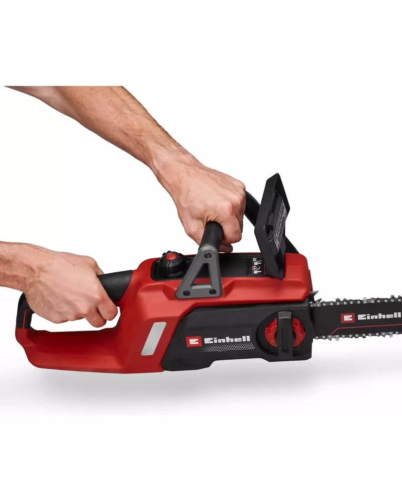 • Pevná kovová zarážka zajišťuje bezpečné a pohodlné vedení, ergonomická rukojeť aku pily Einhell poskytuje pevný a pohodlný úchop. Pro ještě lepší ovládání je držák baterie zabudován do boční části krytu, což baterii chrání při používání a pomáhá dokonale vyvážit pilu.