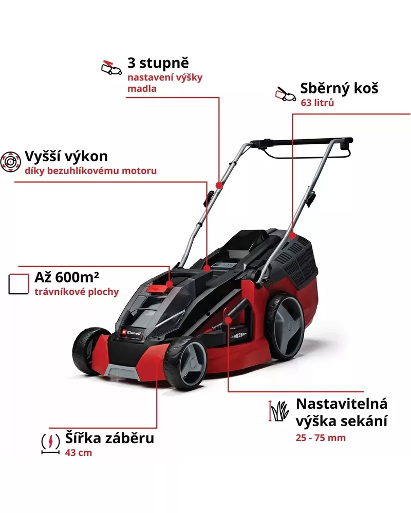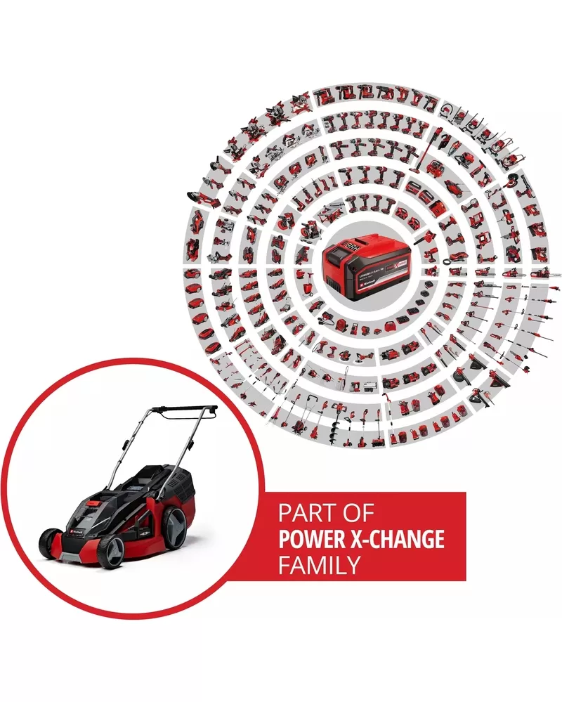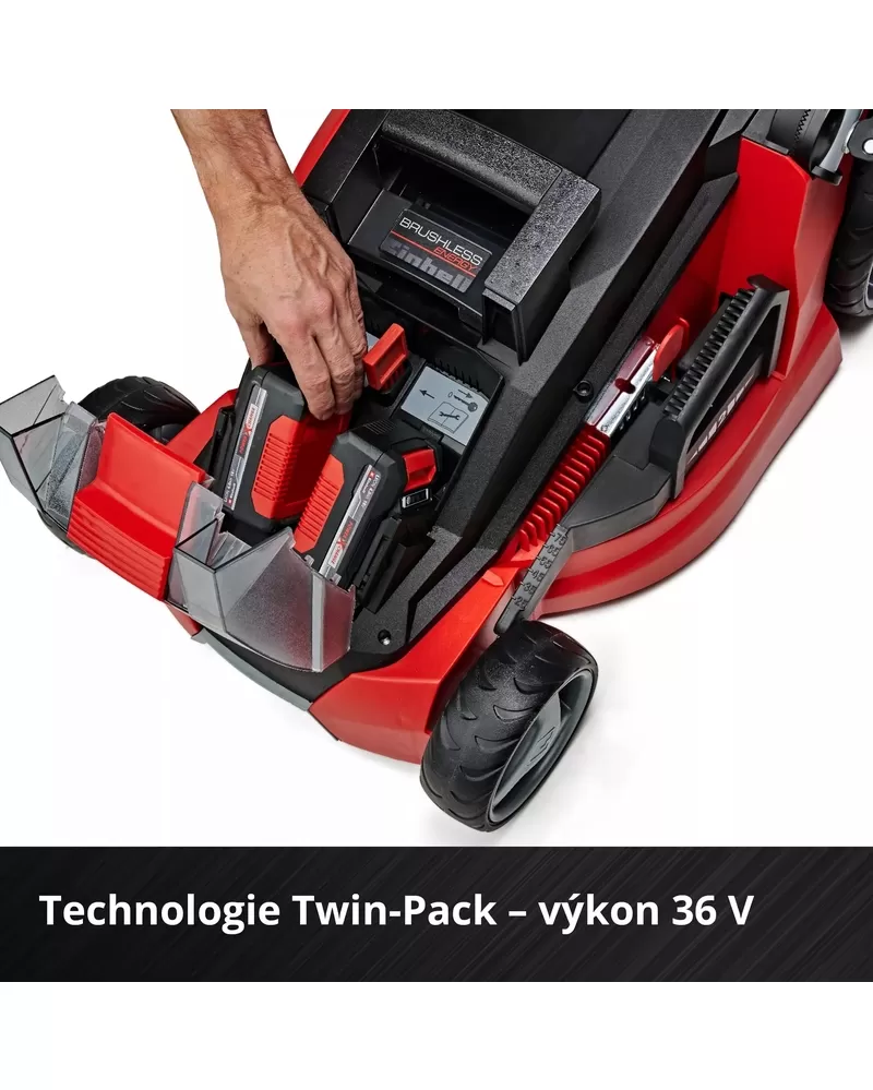 • Díky novému bateriovému systému Power X-Change od společnosti Einhell je sekačka vybavena dvěma výkonnými 18V akumulátory s kapacitou 4,0 Ah pro dlouhou práci bez obtěžujících napájecích kabelů.