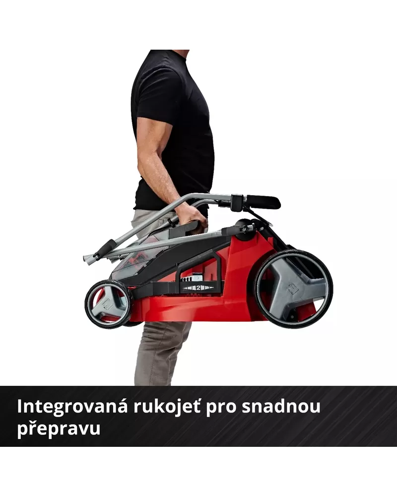 • Pro snadnou přepravu je k dispozici praktické madlo pro přenášení. Kromě toho lze posečenou trávu před jejím rovnoměrným rozprostřením po trávníku jemně rozdrtit pomocí mulčovací sady.