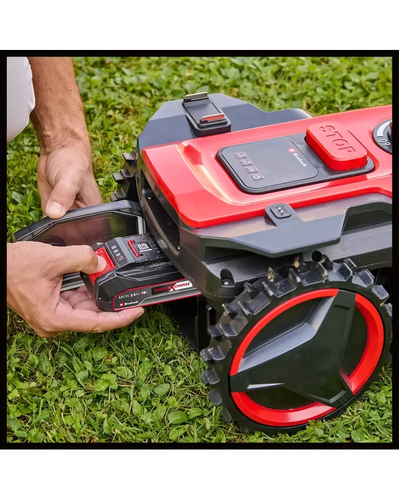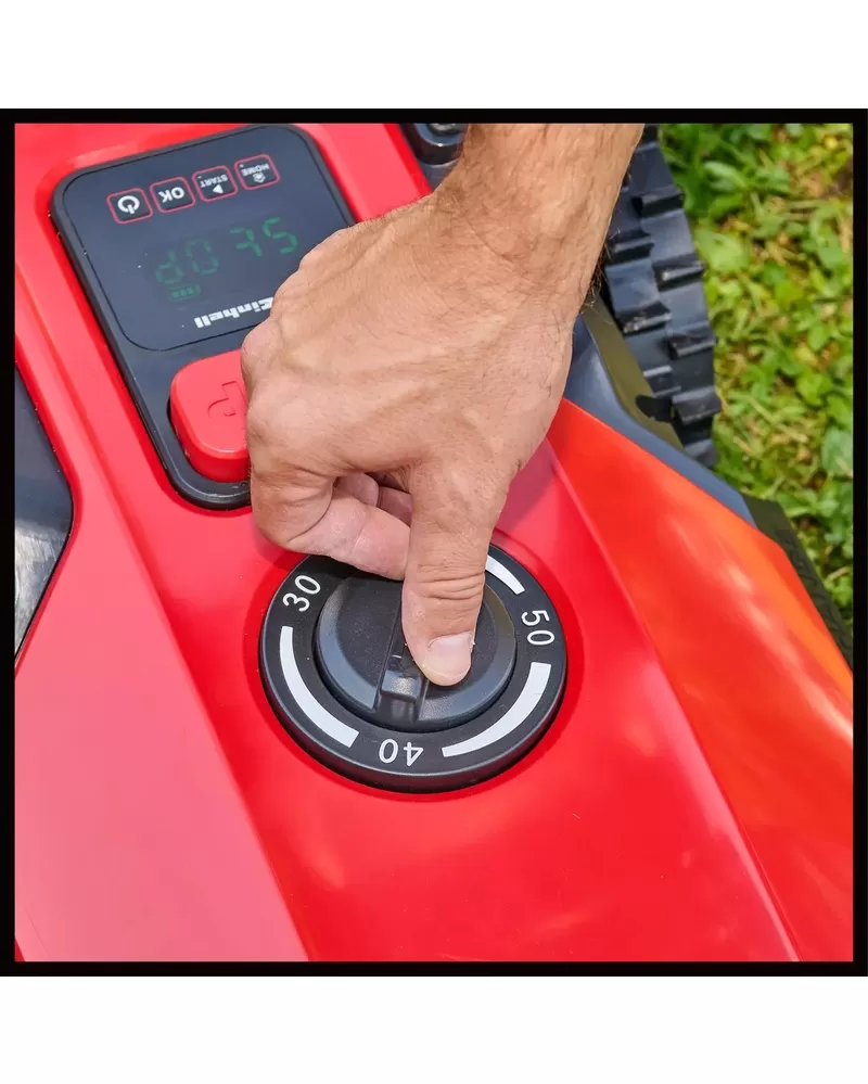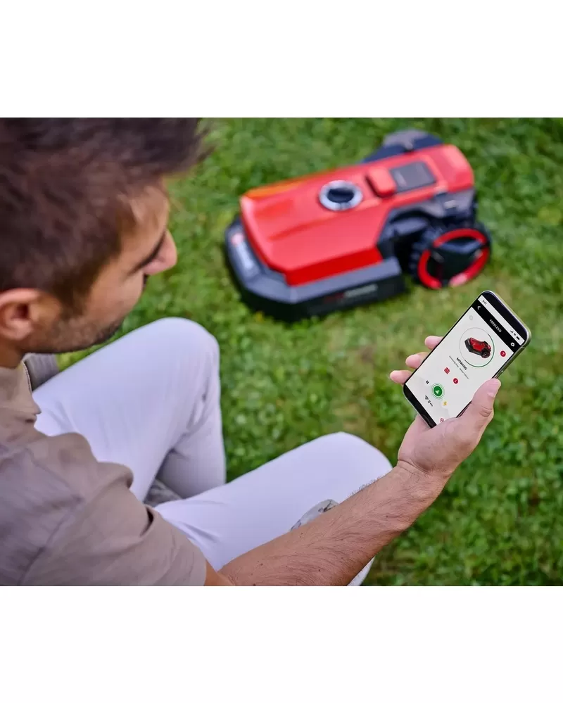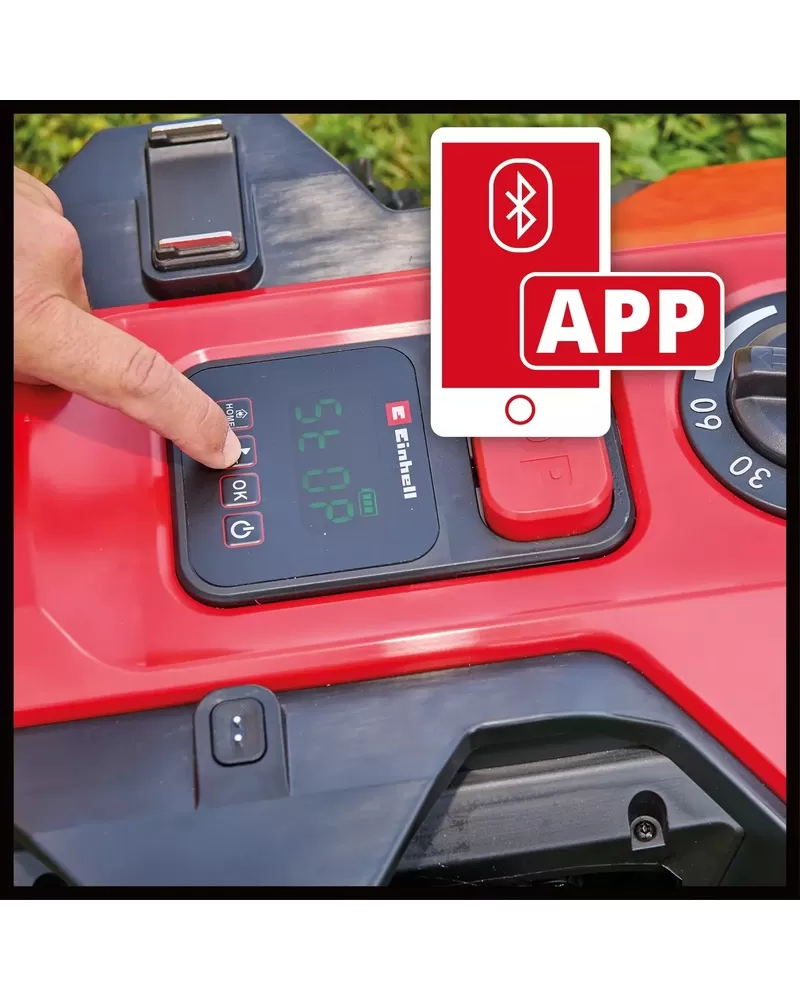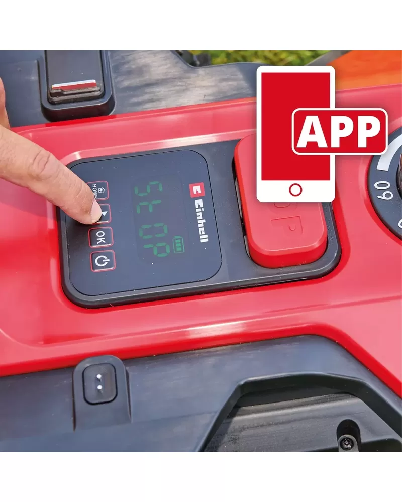 • Časy sečení lze naprogramovat na minutu přesně, a to buď pomocí aplikace Einhell Connect, nebo přímo přes intuitivní klávesnici s LED displejem na sekačce.