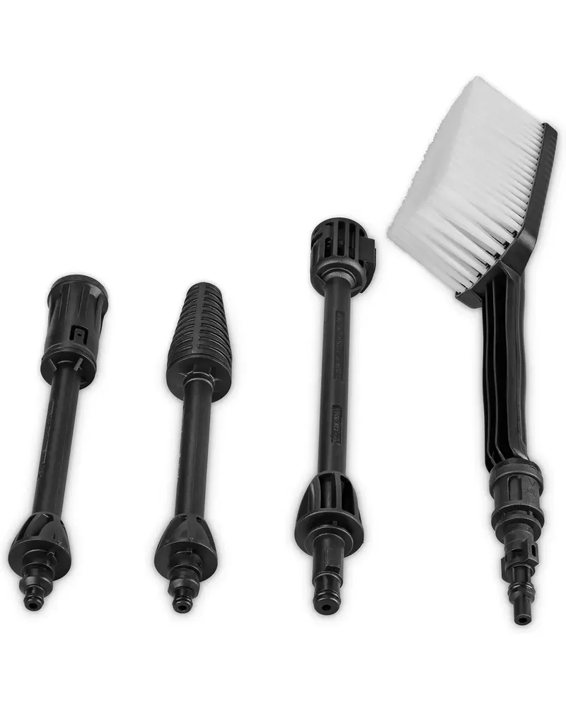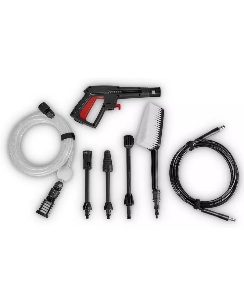 • Aku vysokotlaký čistič je dodáván s pistolí, prodlužovací tyčí, bodovou/širokou tryskou, rotační tryskou a mycí kartáčem. Příslušenství lze úsporně uložit do přihrádek na příslušenství integrovaných do pouzdra.