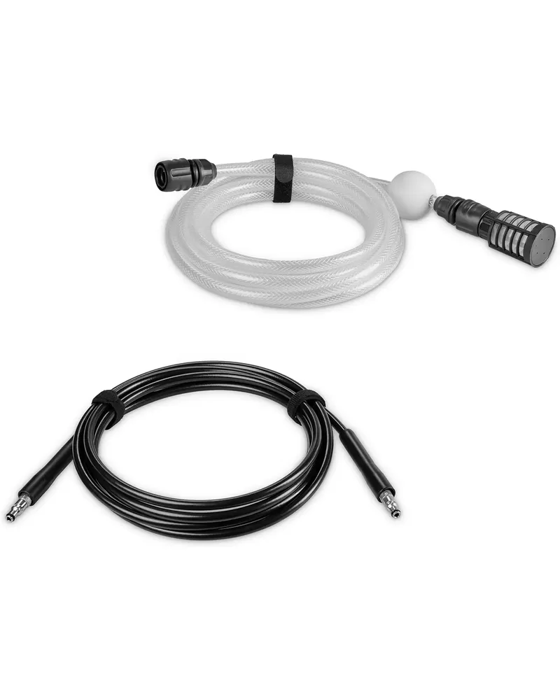 • Příslušenství a hadice lze rychle a snadno připojit pomocí rychloupínacího systému. Tlaková hadice je dlouhá 4 m a 5 m dlouhá sací hadice je vybavena vodním filtrem, takže můžete nasávat vodu z dešťových sudů, kbelíků, rybníků a podobně.